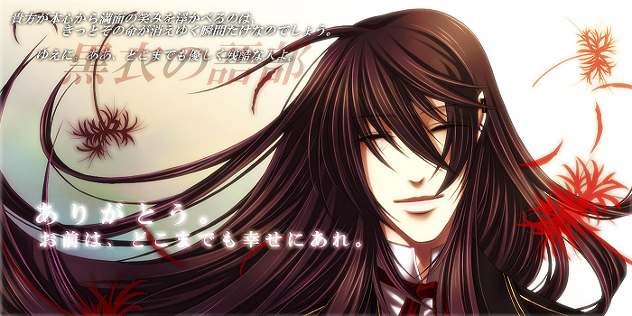 * * * ■■今日トップにしたイラストのJPG版。 どう頑張っても容量が大きくなるので、いっそモノクロのGIF版に差し替えようかと思考しているのですが。 ……キーボードの不調で奔走しているうちに、トップに反応沢山頂いてしまって……どうしようよ私。 ……うーん。このままでも良いかなぁ。 でも、GIFの効果がイマイチ納得のいく感じになっていないのですよね。むむ。 あ、ちなみに。 左上の台詞(詩?)に関してコメント頂きましたので補足しますと。 あれは特に誰か視点という訳ではないですー。 強いて言うなら……私? いや、私というか……作者視点というのが一番正しい、かなぁ。 ■■以下、何だかすごく長いキャラクター考察。 歪は、自身に対して執着を持っていないので……と、言うか。世の中の何に対しても執着を持たない人なので、生きていること自体あまり楽しくないみたいです。 もちろん、刹那的に楽しいとか嬉しいと思うこともあるわけですが……全体的に、感情の動きが薄いのかと。悲しいことも楽しいことも嬉しいことも悲しいことも薄い。 その根底には、生まれたその瞬間からアーカイブと交信できた……どころか、疑問があるとアーカイブが勝手に答えを探して提示していたという状況が少なからず関わっていて。 ……少しでも気になることには、すべて自動的に答えが出てしまう訳ですので……これはもう便利を超えて色々キツイかなぁと。 さらに、現在はアーカイブの内容をすべて把握し、自身の頭の中にアーカイブ内容の目次を作ってしまっている(アーカイブの内容をすべて頭に入れるのは容量的に無理)ので、起こりうる大抵の状況は想定できてしまいます。 それはつまり、ほとんど未来が見えるのと同じ状況な訳で。想定できることだから感動が薄い。 ……人にもよるでしょうが……きっと楽しくないですよね。人生。 そしてその気持ちを真に理解できる人は、彼以外どこにもいない訳で。 狂がもっとも近いですが、それでも同じ目線では見れない。 ■■某方サイトで最近、ヴィジュアル的に大好きなお二人がいるのですが。 今日サイトにお邪魔しましたら、誰か描いてくれないかなみたいな発言が。 ど、ど、どうしよう。描いてみたいすごく。けれど何だか恐れ多いような。 で、でも描きたい……ものすごいツボな外見に内面なのですよね。 個々でも、お二人のコンビでもすごく素敵で。 甘い物好きとか。内向きに流れる髪のラインとか。 ウェーブなセミロングも素敵ですし。その上髭が。あぁぁ。描かせて頂こう、かなぁ。 ぬぬ……でも某方サイトは色々レベルが高すぎて描きづらいんです。 私なんかが描いても良いのだろうかみたいな感が……ひしひしと。 あぁぁどうしよう。 ■■21、22日に拍手を下さった方へ。本当に有り難う御座います! 21日の方など、フル(10回)押して下さった方がおられましたようで。 ……本当に有り難う御座います。そろそろお礼ページ更新できるように努力します; 続きより拍手返信(20日と22日の返信です) 2008.09.21 Sun 14:34:59 日記用絵が……君が前を向くのなら、俺は下を見ていよう。