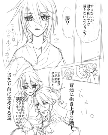 【花を贈るバトン】 ■■花を受け取った自キャラと反応 聖と……申します。ミズナミ様から薔薇で回して貰いました。 僕には勿体無いような言葉も貰って……あ、有り難う御座います。 でも、僕なんかが薔薇の指定でいいんでしょうか……。 ……こんなに素敵な花なら、歪兄さんの方が似合いそうです。 ■■次に花を贈る自キャラ 贈っていいんですかっ? じゃあ、梓に……カラーを。 真っ白で真っ直ぐで……とても綺麗なんです。 ■■贈る花と添える言葉、贈る相手 イメージなので、花言葉はあまり気にしないで下さい。 □熾夜様宅 アキトさんに『ぼたん』 優しくて、けれど気高い。 □雪村様宅 イル陛下に『菊』 高潔で荘厳、けれど身近でいてくれる優しさ。 □直秋様宅 レヴィアさんに『彼岸花』 強く咲く花、けれどどこか悲しい お忙しいようでしたら、そのままスルーしてやって下さい。 最後に。 ミズナミさん……素敵なバトンを有り難う御座いました。 回答が遅れてしまってすみません; 先月今月に拍手を下さった方へ。本当に有り難う御座います。 続きから、拍手返信 2008.08.25 Mon 23:04:48 子供化ゆっきー宅の小さい陛下と無表情な歪のコンビに凄い癒されたので、逆版で描いてみました。 陛下の居城に滞在していた歪。 朝起きたら子供になっていたので、取り合えず子供服を求めて陛下を探してました。 見た人びっくりですよね。ケノン(犯罪組織)拠点の廊下を、ちっちゃい子供がブラウス羽織っただけで歩いてるんですから。 その後見かけられた、ちっちゃい子供を肩に乗せて歩いてる陛下の図もびっくりですけど。 ……一歩間違えると犯罪ぽく見えます。 最近頭のネジが何本か飛んでいる気がする棺です。 あ。歪のデフォ絵に反応下さった方が沢山いてとても嬉しいです。 デフォルメって、楽しいけれど使いどころが分からなくてあまり描けないんですよね。 ちょっと私信 しらちゃん>> 大人化!! 凄く格好良かったです。 減色版なのに、塗りの美しさがすぐ分かるのはさすがのしらちゃんクオリティで。 カラー版が見れる日が楽しみですv あ。えと、そう言えばタイミングを逃していたのですが。 その後ラタトスクはどうなったのでしょうか? 私としてはわりとオススメだと思うゲームです。 ただ……TOSをプレイしていない人が楽しめるのかどうかは少し分かりませんが。 ストーリーがわりと駆け足だったので、物足りなさはあった気がします。 そんな訳で……ストーリー的には、TOSの方がオススメです。TOAはTOSの対極を行くがコンセプトだったらしく、TOAが駄目だった人でもTOSはプレイしやすいかと思いますー。 全体的に、優しくて切なくて、でも最終的には希望のあるお話でした。 今更でしたらすみませんです; 琉綺さん>> 愛称呼び嬉しいですー。 バトンキャッチして下さって有り難う御座いました。 ユフィさんのショックっぷりが可愛らしかったです! 子供化と全然関係ないですが、髪の流れが流麗で凄く素敵でしたvV 実は、琉綺さんキャラの中で最も好きなのがユフィさんとラインさんなので……。 物凄い嬉しかったですvV あ、それから。バトンも受け取っておりますー。有り難う御座いました。 雨色空さん>> バトン拾って下さって有り難う御座いますーvV 会話もイラストもものっそい可愛らしかったですvV 拍手歪にも反応頂いて……物凄い嬉しかったです。 先日はシュラさんお貸し頂き本当に有り難う御座いました。 続きでゆっきーに私信 |