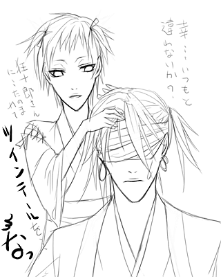 歪と狂と天帝様はやったので、今回は榊と幸で。……ここまで来ると、次は刃か綴? 【ツインテールでお願い!バトン】 ※ルール 指定された持ちキャラをツインテールにして下さい。なるべく頭の上の方で。 そしてその様子を絵に描いて下さい。 質問はキャラになりきって答えて下さい。 指定:拾って来たものなので、勝手に幸と榊 ■■今の気分は如何ですか? 榊:これは……流石に 幸:可愛い……です、よ 榊:君は可愛くて良いけれど、私は……複雑だ ■■回りの人から見た反応は? 刃:ぶっは、おまっ、それ………くっくくくくっ(抑え気味の爆笑) 榊:幸。これ、外してくれないか 幸:駄目、です……今日一日はそれでいてって……狂十郎さん、が ■■普段からこの髪型で居られそう? 榊:………嫌だ 幸:私、は……髪が短い、ので……すぐに取れてしまい、ます 榊:いっそ私も切りたい 幸:……駄目、です……毎日、榊の髪を梳くのが、好き……だから 榊:…………(言葉は嬉しいけれど、現状があるので複雑) ■■どこのお宅の誰をツインテールにしますか(5人くらいお願い) 白ちゃんちの……トレーズさんドゥーズさん、とか。 薄荷さんちのイリスさん、とか。 ミズナミさんちの人形屋敷のお二人、とか。 熾夜さんちのアキトさん、とか。 雪村さんちの陛下、とか。 激しく微っ妙なチョイスですみません。宜しければ、お受け取り下さい; |