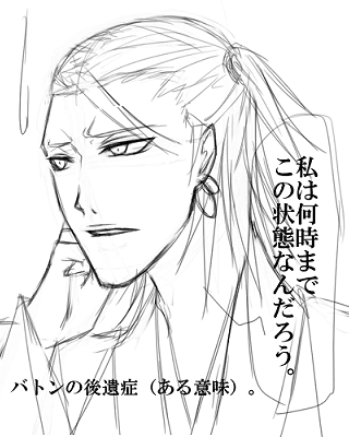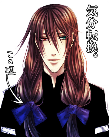 最近やたら落書きが進みます。勉強が進まない分落描き時間が伸び……。 こういうのを五月病と言うんですかね。もう六月ですけれど。 いい加減何とかしないといけませんね。うん。 現在描き掛けのイラスト(ミドルショット)を、ちょっと引き伸ばして設定画っぽくしました。 全身画の練習中です。 何か……身長185くらい設定にしては足が細くなってしまった、かなぁ。 妙に女性的なラインになってしまったような。 6日、7日に拍手を下さった方へ。本当に有り難う御座いました! 雪村様>>やっぱり似ていますよね! 本家様にそう同意して頂けて凄く嬉しいです。 37度! その絶妙な表現素敵です。45度にちょっと足りない所が彼らっぽいですよね(笑)。 バトンも気付いて下さって、有り難う御座います。 ものっそい楽しみに待たせて頂きますvV 2008.06.07 Sat 15:38:48 気分転換某方の日記ネタを読んでいて。 物凄いやってみたくなった結果……↑が。 似ていると思うのですよね。時々謎の行動を取る所とか。 陛下万歳。 歪の場合、何が恐ろしいかと言うと。 常識でない事のラインをしっかり見極めた上で、それでもやる所が厄介です。 基本常識人の皮を被っていますが、色々突き抜けた人なので……感性や価値観がずれてます。 普段が常識人で誰よりも大人な人なだけに、時々の奇行に対して周囲が受けるダメージは大きい、らしい。 ……うん、流石くーさんの息子。 その辺り似ている上に、何か歪においては大分グレードアップしてるような。 まあ。くーさんは確信犯ボケなんですが。歪は天然。 ……歪は、自分の感覚が他人と違う事を理解しているので、ある意味……確信犯? 凛紅さん>>バトン有り難う御座いました! 榊を気に入って下さったようで……物凄い嬉しいです。 2008.06.06 Fri 16:21:56 今日のチャット会について2008.06.06 Fri 16:20:08 ツインテールでお願い!バトン凛紅さんちから頂いてきました。このタイプのバトン大好きです。