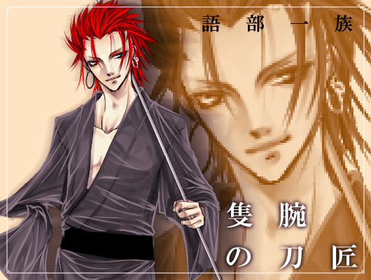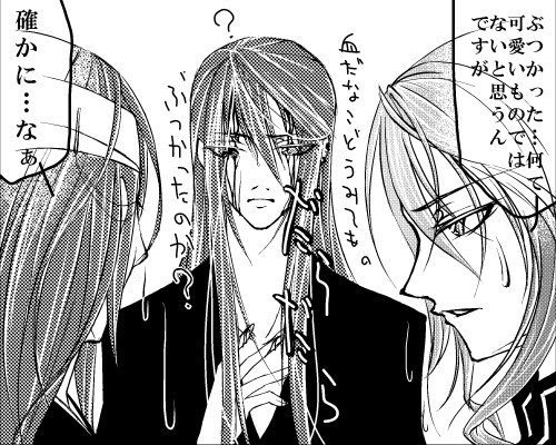 何か凄いのが沢山発見されました。 まず第一点目。プロトタイプ榊。 まだ名前も決まっていない状態で。これが最初に描いたもの……かな。 オールバックは変わりませんが、髪は赤かったです。後、隻腕でした。 何がどうなって現在に? と問われれば、多分逆/転/裁判の影響かなぁと答えます。 この頃の榊の性格は、確かまんま狂でした。 名前は、響(ヒビキ)にするか榊(サカキ)にするかで悩んだ、はず。 あれ……響(ヒビキ)と迷ったのは狂だったかな。 二点目。左が刃。右が要。 アイコン用ちびキャラ集でした。 注目は刃。この頃は、髪の毛逆立ててました。後、髪の色も緑じゃ無かった。 ちなみに、この二人は歳一緒です。幼馴染みたいなもの……ですね多分。 性格上、恋愛には絶対発展しませんが。腐れ縁、みたいな。 三点目。左から、狂、歪、綴。 多分このブログのどこかに、↑の会話文章のログがあるはず。 コミックワークスを使って描いた一コマ絵。 注目は、歪と狂の髪。特に狂。 歪は外ハネではなくストレートで、狂は今よりストレートな上に長髪です。 初期設定では、歪と同じくらいの長髪設定でした。 後ろ姿がややこしい上に、サイトが長髪だらけになるのでばっさり切って貰いましたが。 たまに過去絵を見ると、色んなものの意外なルーツを思い出したりして面白いですね。 日記のネタが無くなったら、また発掘して来ようかなぁ。 ど、どうしよう! うちの子板に投稿してきた殿下(天帝)にコメント付けて貰えないなぁと残念に思っていたら。 何と、よその子板で描いて下さった方がっ。 しかも……あのちくま様。PCの前でものっそいニヤついてしまいました。 う、嬉しいだけに、明日になって夢だったらどうしよう; ど、ど、どうしよう! 薄荷さん宅でやってしまいました; 素敵な企画を計画されていたので、参加表明させて頂いたのですが。 5回くらい見直した癖に、記入事項一個書き忘れてたっ!? 何たる……。 あまりに緊張し過ぎて忘れたらしいです……あぁぁぁぁ(落ち込み)。 そんな私に柔らかい対応を有り難う御座いました; 何かもう色々ご迷惑をお掛けしてすみません; 薄荷さんの大人で優しい応答に物凄く救われました<<薄荷さんへ PR 2008.06.08 Sun 00:09:18 日曜日は日曜日(既に今日ですが)は、もしかしたら日記が描けないかもしれないので、今のうちに一つ。