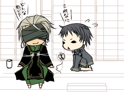 指定頂いた方のサイトよりキャラクターをお借りするという事なので、ここぞとばかりに狛犬様お借りします! キャラクター間違っていたらすみません。 一人目には歪を指定して頂きました。二人目は、迷った結果、狛犬様と目隠し繋がりで榊に。 宴とか狂とか刃とか焔とか本当に迷ったのですが。 実は、男性二人女性一人で、「選択肢一つしかねぇじゃん」みたいなのがやりたかった(笑)。 黒狼さん! 素敵なバトンを有り難う御座いました。 回答が遅れてしまいすみません; |