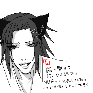 何と。格好良いの項目にあげて頂いて;恐縮です。 イラストの方向性について、暫くあぁでも無いこうでも無いと迷っていましたが。 やっぱりこの感じです! うん。私が絵を描くのは空気感が表現したいからなのだと気付きました。 夏のじっとりした空気とか、春の柔らかい空気とか。 秋の少し寂しい感じの空気とか。冬の切れそうに切ない空気とか。 今回は、↑を表現するため環境光にこだわってみました。 オーバーレイと、加算、乗算が活躍です。 特にオーバーレイ。空気感の表現には便利ですよねぇ。 あぁ。これですっきりした。 キャラクターは、かをる様宅よりテントさん。 ……どうしよう。激しく似てない。 一生懸命修正したのですが……これが限界でした。 あの不敵で素敵な笑みが好きなのにっ……それが難しくて; 何だか大分老けたようで。 いっそオリジナルにしちゃおうかと何度も思ったのですが。 ……大分頑張ったので公表させて頂きます。 サイト改装準備中につき、暫くイラスト+漫画+頂き物類の更新が滞ります。 ですが、その間はブログ(ここです)にて作品公開して参りますので……。 まあ、結局の所、更新頻度は変わり無さそうです; 続きにて私信格納 2008.03.16 Sun 22:31:53 絵チャにて某方のおうちの絵チャに猫一匹描き残し。