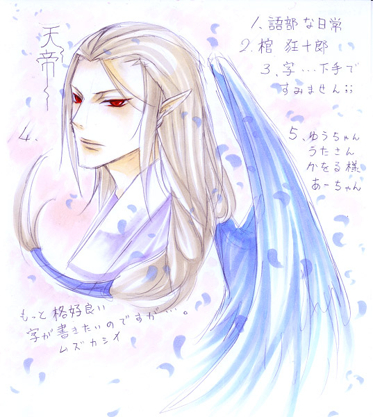 ―大気は全て彼に従い ―御霊は全て彼に焦れる ―世界は彼の為にある ―彼が涙を流さぬならば ―世界は代わりに涙を流し ―彼が怒りに震えるならば ―世界は迷わず闇に堕つ 何を思ったか、髪下ろし天帝陛下。見事なまでに誰だか分からないよ。 前々から、一度は描きたいと思っていた、天帝陛下の雨に佇む姿です。 最近モノクロに目覚めました。 難しいけれど、上手くいった時には妙な達成感があります。 まずはグレーから初めて、最終的には単色(トーン)の漫画が描けたらなぁと画策中。 ほら来たよ 語部が 真黒い喪服に身を包み 緋蒼の瞳は事実を見つめる 語部寄れば歴史が動く それは破滅か 繁栄か まるで 終わりを知るかの様に まるで 初めを知るかの様に 黒の識者がやって来る さてここは 終わるかな さてここは 進むかな 喪服の識者も知りえない 私信 玲那…ちゃん(心臓バクバクです)>> 昨日はどうもコメントがすれ違ってしまって様で…すみませんです; ちゃん付けめちゃめちゃ光栄です! …折角お言葉頂いたので…私もちゃん付けで呼んでみたのですが。 慣れない様な、勿体無い様なでつい「…」が付いてしまいます(笑)。 バトン本当に有り難う御座いました! あ、日記のメイキング!毎回ドキドキしながら拝見しておりました! アマトちゃん>> くー父さんに反応有り難う御座います! 不器用…と言うか…何と言うか……とりあえず、三つ編みは苦手なのかと(笑)。 繊細な手さばきが苦手と言うか。魚捌いたり、木に細工したりは得意ですよ。 歪は普段余り手を出す人では無いのですが…くー父相手だと遠慮が無いですね。 この親子は何か微笑ましいと思います。私も描いてて楽しいですv キャラリレー完結おめでとう御座いますー。 最後のお二人の会話が何だか素敵でした(笑)。表情も可愛くてvV 刃と聖の仲が悪かったらこんな感じなのでしょうね。 かをる様>> Σ何だか物凄く反応頂き有り難う御座います! くー父さんは最近やたら活躍中で……。 それもこれも、反応を下さるかをる様のお陰ですvV あ、全然関係が無くて恐縮ですが。シンシアさんめちゃめちゃ可愛いですよね。 SDって……ちょっと値段帯が高くて手が出ないのですが。 実は凄く憧れていて……。日記を拝見しては癒されております! …ちなみに。宜しければなのですが…お聞かせ下さい。 SDを一人迎えようと思うと、最低幾らかかりますかね; 2008.02.20 Wed 16:58:17 自分の字で書いて載せるバトン玲那さん、はーさんから回して頂きました。実はりっちゃんちからも強奪。