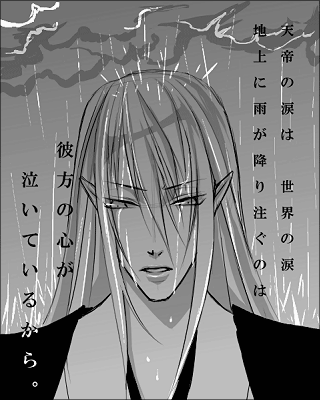 語部で本編を作るとしたら(語部には本来メインストーリーは無いので)、ラストのシーンになるかと。 歪(ヒズミ)ラスボスエンディングです。 要(カナメ)の思い。 風呂で進行を組み立てていたのですが……。 感情移入しすぎて危うく泣きかけました。 自分の作った話で泣くとか……ある意味凄いなぁ。 PR 2008.02.21 Thu 17:49:36 雨が降る 涙落つ―地上の全ては彼のモノ