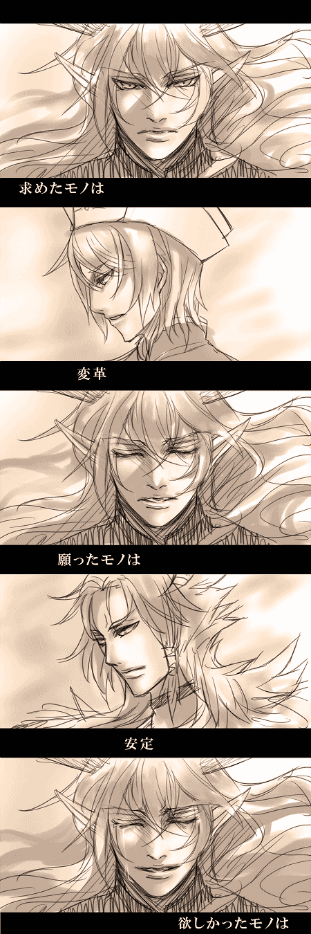 …………13日の金曜日……? 主催でチャット会を行うことについて、思えばかなり長期間悩んでいたのですが。 もう、この辺りでいい加減に決着をつけようと思います。 私は、3年以上続けているこの定時チャット会の方針に、間違いがあるとは思いません。 管理者として至らない点は多いですが、目指す方向、思い描く形が間違っているとは思いません。 私にだって、今までサイトを問題なく管理し続けてきたことに対しての矜持があります。 拙い点が多いことは確かだと分かっています。力不足を痛感することも多々あります。 けれど、目指す形そのものを否定されたら、やはり悔しく思います。 だから、踏ん切りをつけるためにも、ここで宣言します。 私は、私の目指す形に間違いがあったとは、思いません。 本来なら、こんなところに書く内容ではないと思うのですが。 どこかで言わずにはいられなくて、書ける場所がここだけだったので、この場所を利用しました。 ご静読ありがとうございます。不愉快に思われた方がおられましたら、申し訳ありませんでした。 2009.11.08 Sun 01:41:10 願うモノ欲しかったモノは。欲しかったモノは…………欲しかったのは、何だった? 陛下が沢山と、あとエーメとシシェン。雪村様宅より。 エーメと陛下はいいとして……シシェン……もしかしてゆき宅にも一枚もないんじゃ。 オウガと人のハーフなケノン平メンバーで、陛下を「とーさん」とか呼ぶ猛者です。 ゆき>>シシェン出しちゃいましたが……問題などありましたら、ズバッと言ってやって下さい; 今回は十二/国記のサントラを聞きながら作業してました。聞いただけで泣きそうになる曲が沢山。 ……アニメのシーンを思い出します。原作もアニメも素敵でした。本編の続刊でないのかなぁ。 そして、↑実はあと6コマくらいイメージがあるんですが……もう面倒くさくなってきた。 陛下の表情差分を山のように描きたくて始まった絵なんですが。 間に他のキャラを挟むのが大変です…………陛下はいくらでも描けるのに(笑)。 ついでにもう一枚。↓になるちょっと前。みちとのそうぐう。 ■拓海さんとせんりへ。私信ありがとうございます。お返事ちょっとお待ち下さい; 碧も、バトンにわざわざ反応ありがとうございました; ……私生活が……大変そうですね…………その、頑張りすぎず頑張って下さい;; 2009.11.07 Sat 17:50:12 ベタベタ…てか、てらてらアナザー世界(雪村様宅)に滞在中は、イリス(奇術師さん)宅に泊めて貰ってる歪。 雨の日になんか拾ってきたみたいです。 セリア(魔術師):お帰りー。雨あたってたでしょ? タオル用意したから早く拭いた方、が……て、いやいやいや、何持ってるのソレ。 歪:帰り道で拾った。 イリス:ひろ……うか? 普通。 歪:雨に濡れていたから、つい。 セ:犬猫を拾った時の定番台詞だけど、それ違うからね。と、言うか……雨に濡れたら元気になりそうなんだけどコレ。むしろ。 歪:…………可愛かったから、つい。 セ:それも犬猫を拾った時の常套句だけど。と、言うか……どこが? 歪:俺が寄って行っても逃げなかった。 セ:……ああ。うん。動物に嫌われる性質……だったね。だからってそれは。 イ:……とりあえず……とりあえずまず肩から下ろせ。てらてらになっ………てるな。 歪:………………か…… セ、イ:えないぞ(よ)。 セ:残念そうにしてもダメだからね。それ絵師のだから。返さないとダメだから。 イ:……逃がすような……モノなんだな……。 セ:そもそも……逃げたいとか思う意思があるんだね…………コレ。 そんな彼らの名前は、ぽち(青い方)とたま(赤い方)。 ■ゆき宅の紹介ページのぽちたま絵があんまり可愛かったので……つい。 なんでしょう。あのつぶらな瞳とか、何を考えてるのか分からん表情とか……ときめきました。 とくにたまの、あの、どこかを一心に見つめているような気がする表情が素敵すぎました。 ぽち派かたま派かと聞かれたら(誰も聞かない)、私はたま派だぁああああ(聞いてない)。 ゆき>>台詞や状況に間違いなどあったら指摘の方お願いします; 歪の正式衣装…………久し振りに描きました。けれど、実はこれでも色々はしょってます。 髪型も変わっているので……そろそろ手直しが必要な時期だろうか。 |