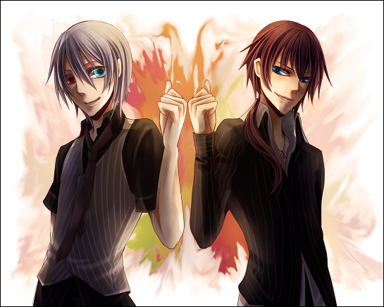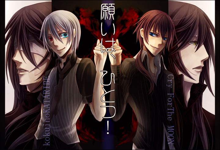 すべて決めてくれる人が。すべてを分類してくれる人が。 常に正しく。すべてを知って。すべてを司る。 そんなヒトがいたら、すがれるものね。 * * * 「取り戻すんだ」 ↓記事の絵のその後。クリックで拡大。 力尽きた。そして今気づきましたが、なんだか同人誌の表紙背表紙みたいですね。 キャラクターは、左から、歪、聖、ヘンゼルさん、竜駒さん。 背景と構成をどうするかさんざん迷った挙句、歪と竜駒さんを描き足させて頂きました。 歪は2年後軸ラスボス版。片目隠しから両目隠しに変更しました。 セリフは、ヘンゼルさんと聖の本編軸イメージです。 けれどどちらの本編も……こんな風に明るくは進まないのだろうなぁ。 ■センリ様>>今晩はー。やっとのことで線画塗りました。 素敵な線画を、しかもわざわざ描き下ろして頂いたからには、ばっちりしっかりがっつり塗りたいと思って……いろいろ考えてみたりしたのですが……難しいです。 すでに多所にて、素敵絵師様方に染められていましたので……さらに悩み(笑)。 こう、自分らしさを出すって……難しいですね。 …………違う、なぜに塗り語り……話がそれました。 こたびは、素敵な線画をありがとうございました!!! ものっすごく楽しく染めさせて頂いた上、ものっすごく勉強になりました。 テスト大変そうですが、もうひと踏ん張り頑張ってください……。 それから……何か悩みがあるときは、どうぞ無理しないで下さい。 モヤモヤしている部分を、モヤモヤしたそのまま話して頂いたら、私も一緒にモヤモヤ悩んでみる所存ですので。ディスカッションで、悩みが何なのか分かるかもしれませんし。 話せ、と言う訳ではもちろんないですが……そして、私で役に立てるようなことも少ないのですが。センリが望むときに、少しでも力になれたなら……幸せに思います。 * * * けれどそれは、等しく停滞を招く。 どうしてだろう。いつだって、求めるものは、もっとも忌避すべきモノ。 どうしてだろう。それでも、求めてやまない。 ……穏やかであればいいのにと。傷つくことがなければいいのにと。 さあ、何が正しいのだろう。 人は恐れる。過ちを。それをなしてしまうことを。 ……どれが過ちなのかなんて、誰にも分かりはしないのに。 2009.07.21 Tue 18:48:18 センリ様より足りない。足りない。足りない。