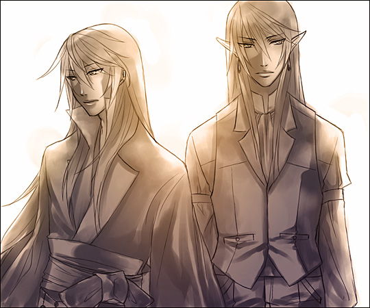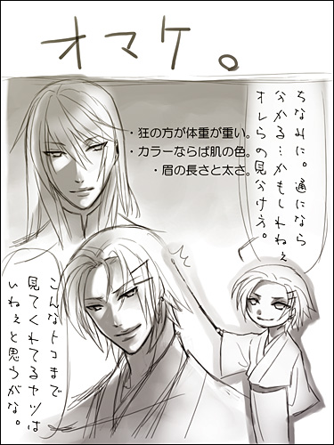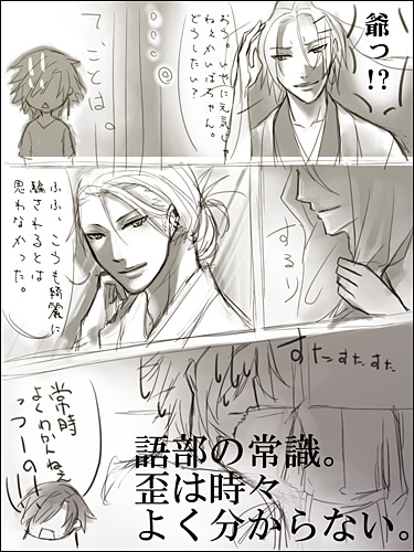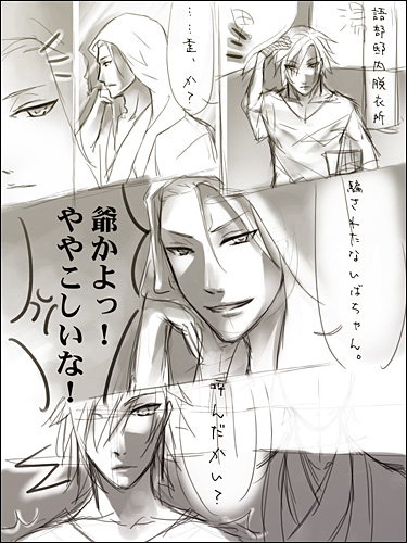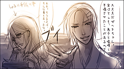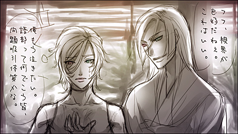 焔:そのままの方が可愛くていいと思うよ綴。 綴:なんにも嬉しくない褒め言葉だよ。焔。 焔:胸大きいしねぇ。ウフフフフフ……飾り付けたい。 綴:………………飾り『付ける』? クリスマスツリーじゃないんだから。て、何をじりじりと近づいて来てるんだ……ちょ、止めろ焔!! ぎゃー。 こんな二人。多分一応カップル。 きっと綴はグラマー体型。 ちなみに。焔は女性の体を眺めるのが好き。 変な意味ではなく、造形的観点からの鑑賞…………らしいです。 大方の予想を裏切った第二段。だと……思われます。 予想をして下さった方がおられたとしたら……ですが; 刃は逃げおおせました。綴は逃げたけれど、焔に捕獲された。 2009.05.26 Tue 20:53:33 そんな親子狂:大丈夫だぜへきちゃん。実はオレも、息子と喧嘩して半壊させたことがあるのさ! 歪:ああ。そう言えば、そんな事もあったな。 碧砂様に「狂さんは笑って許してくれそうだけれど、本邸が瓦礫と化してしまったらどうしよう(前回のイラストにて、ステージ選択が『語部本邸』だったので)」みたいなコメントを頂いたので……返信絵。 昔のこと。狂と刃、綴と焔が本気で模擬戦を行うたびに本邸が傷んでいたので。 徐々にエスカレートしつつある本邸破壊活動に溜息をついた歪が、狂相手に切れたふりをして「いい加減にしないと俺も怒るぞ」と見せしめ。 狂も刃も綴も焔も、それ以後はちょっと気をつけるようになったというお話です。 ちなみに。歪は左利き↑。 本邸に送られてくる、各地の語部からの報告書と資料の整理業務を手伝い中。 実は、狂がサボり魔な訳ではなく、仕事量が尋常でなく多いんです。 狂は自身の怠慢のように見せかけてますが。そして実際にサボってもいますが。 掛けているサングラスは、アーカイブの五感データや文書データを見ながら、書き物をするための品。普通の語部ならば、目を瞑って現実の情報をシャットアウトしてからデータを下ろすものですが、歪は現実と五感データの同時処理ができます。 けれど一応、情報量を減らすためにサングラス。 ■阿様宅で、画面にパースをつけるといいというお話を聞きまして。 なるほどなあと思いました。そうなんですよね。 人物だけの構図で立ち絵を描くにしても、例えば肩なんかにはパースがつくんですよね。 自然なポーズで、けれど生き生きとした雰囲気の人物が描きたいです。 要修行。道は険しく遠い(笑)。 ■ゼリ子様宅の、例のネタ漫画が……絶妙なバランスすぎてどうしようかと。 キャラクターの性別を変えるのって、意外に難しいんですよね。 顔立ちはどこまでが個性で、どこからが性別による違いなのか……とか。 私が描いた狂の絵の場合は、全体的に丸めなラインにしたのですが。 ゼリ子様宅カイナさんの、性別と個性のバランスが絶妙でした。可愛い。 微私信>>見て下さったんですか…………女性絵が毎回可愛らしくて素敵なことに定評のあるぜりちゃんが。私の、しかも落描き的なアレを。なんだか、無性に恥ずかしいです。けれどありがとうございます。もっと胸を張れるように精進します(笑)。 ■続きより拍手返信。 |